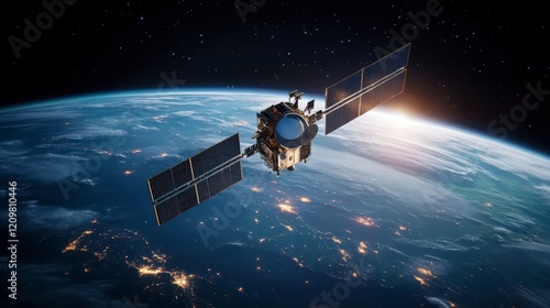 Satellite orbiting Earth at dawn, capturing the planet's illuminated surface and atmosphere