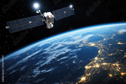 Satellite orbiting Earth in space with stars and atmosphere visible, symbolizing global communication and technology.