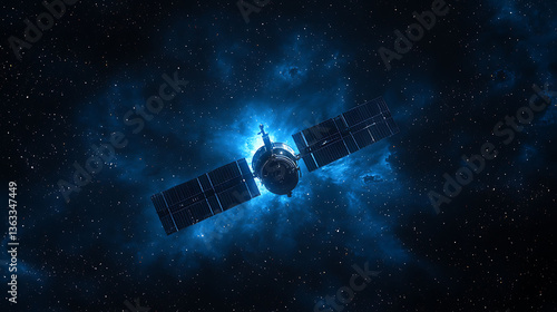 Satellite soaring through a vibrant nebula, symbolizing exploration, discovery, and technological advancement. Perfect for illustrating space travel, innovation, or futuristic concepts.