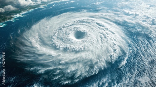 Satellite view of a huge spiral hurricane. Powerful forces of nature. The storm vortex is very large and has a hole in the center. Predicting and studying weather events. Illustration for design.