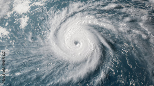 Satellite view of a powerful tropical cyclone swirling over ocean waters, showcasing a defined eye and spiral cloud formations