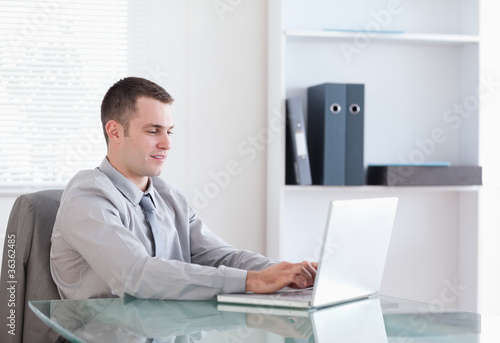 Satisfied businessman working on his notebook