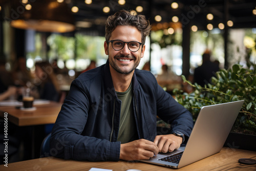 Satisfied young man with glasses sitting at a desk and doing paperwork at his workplace.