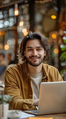 Satisfied Young Professional Working Remotely in Cozy Cafe Setting