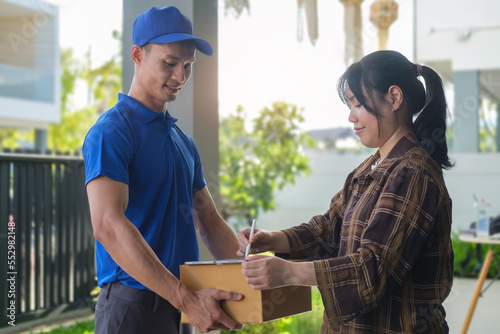 Satisfied young woman putting signature on digital tablet, receiving package from male courier.