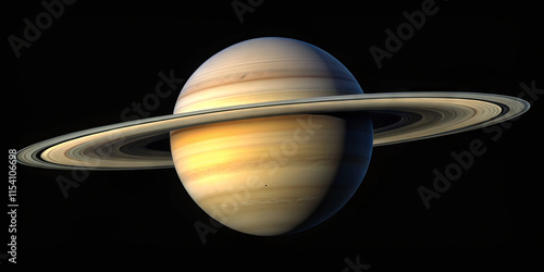 Saturn is prominently displayed with its extensive ring system illuminated by sunlight, revealing its beautiful pastel colors against a dark backdrop of space