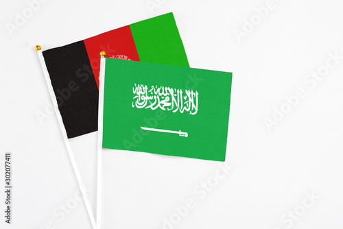 Saudi Arabia and Afghanistan stick flags on white background. High quality fabric, miniature national flag. Peaceful global concept.White floor for copy space.