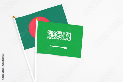 Saudi Arabia and Bangladesh stick flags on white background. High quality fabric, miniature national flag. Peaceful global concept.White floor for copy space.