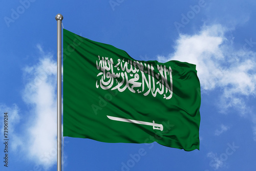 Saudi Arabia flag fluttering in the wind on sky.