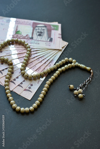 Saudi Riyal currency notes with Islamic prayer beads. Conceptual photo for Sharia'h or Islamic finance.