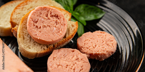 Sausage spread sandwich pork spread natural product tasty snack fresh delicious gourmet food background on the table rustic top view copy space