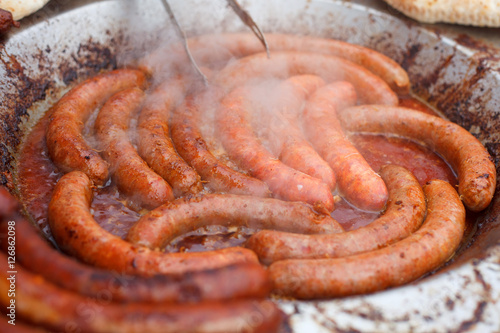 Sausages Frying In A Skillet. Sausages fried in fat.