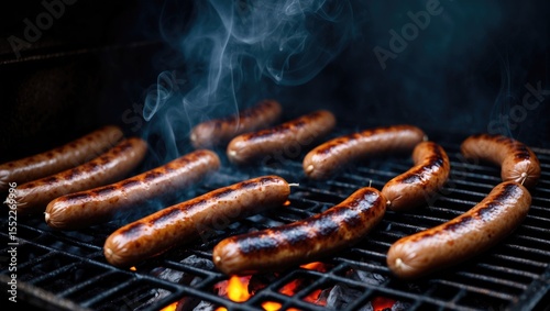 Sausages on the grill fire grate smoke barbecue with empty copy space for text