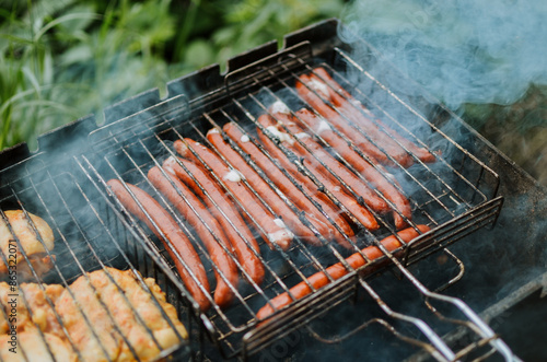 sausages with smoke on a grill in nature on a lake in summer in Estonia
