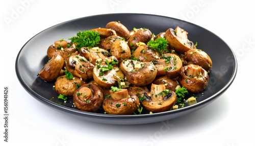 Saut?ed mushrooms with garlic and parsley on a dark plate, isolated on white