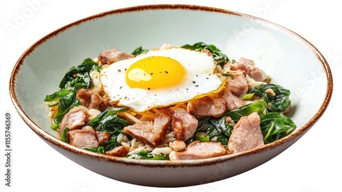 Sautéed pork with basil and fried egg served in a bowl showcasing vibrant colors and textures of a traditional Thai dish.