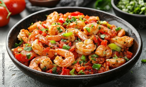 Saut?ed shrimp with tomatoes, herbs, and spices in a bowl, ready to be served