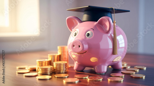 Save for success pink piggy bank wearing graduation cap surrounded by gold coins future investment education savings