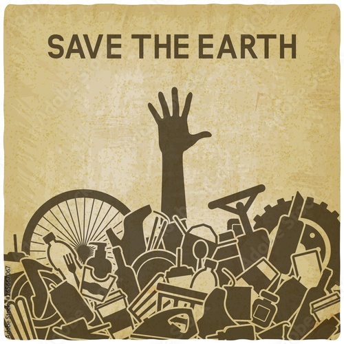 Save the planet concept. Littering planet with human waste. Man drowned in garbage