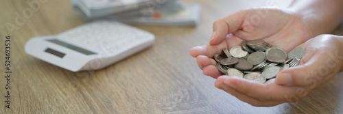 Saving money for Real estate investment with stack of money coins for buy home and loan for prepare in future financial insurance. Accountant verify growing business concept