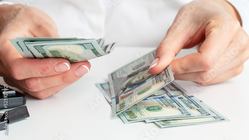 savings, finances, economy and home concept - close up of woman with calculator counting money and making notes at home.