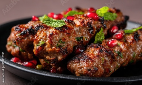 Savor smoky chapli kebab topped with cracked pomegranate seeds and green chili on a striking charcoal black plate