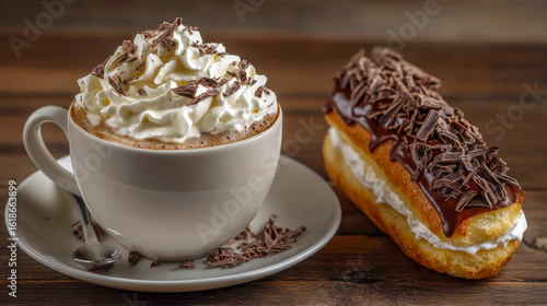 Savor the warm ambiance as a creamy cup of coffee filled with whipped cream and chocolate shavings pairs perfectly with a rich mini éclair on a charming saucer, inviting sweetness into your day