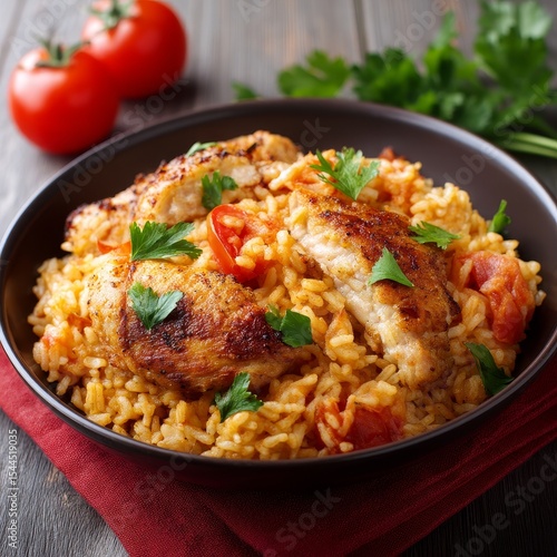 Savoring a flavorful chicken dish with spiced rice and ripe tomatoes in a rustic kitchen setting