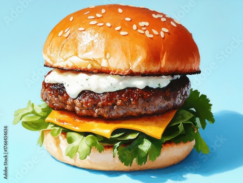 Savoring chipotle aioli burger with fresh cilantro closeup angle vibrant colors warm light
