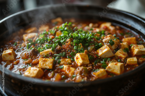 Savoring the spicy richness of Mapo Tofu served in a cozy Sichuan eatery during a warm evening gathering