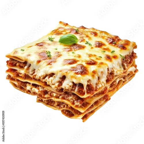 Savory baked lasagna layered with cheese, meat, and sauce, presented in a crisp, white background for a clean look.