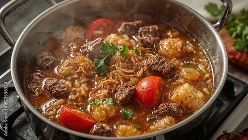 Savory beef kharcho with rice, tomato, plum puree, fried onion, and fresh cilantro boiling in a large pot on a gas stove