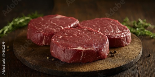 Savory beef steaks displayed on rustic wood offer a mouthwatering visual appeal. These delicious beef steaks highlight the rich textures and colors, perfect for any culinary setting featuring beef