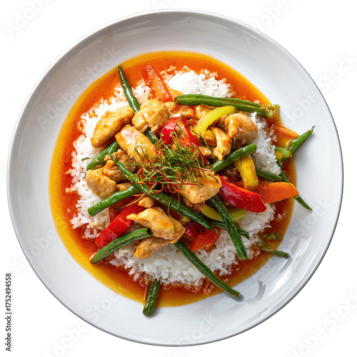Savory Delight: A mouthwatering plate of vibrant chicken curry, complete with rice, and assorted vegetables, a feast for the eyes and a culinary adventure for the senses.