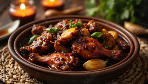 Savory Filipino chicken adobo simmering in rich sauce, home comfort