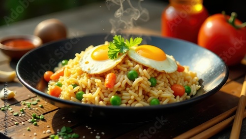 Savory Fried Rice Bowl Topped with Perfectly Cooked Sunny-Side-Up Eggs and Fresh Herbs