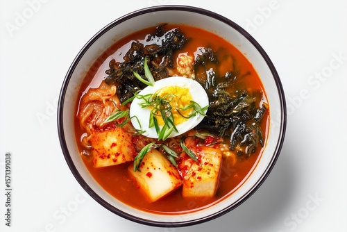 Savory kimchi ramen bowl featuring soft boiled egg, fresh vegetables, and rich broth against a clean white background