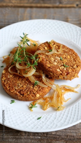 Savory lentil patties topped with caramelized onions and fresh thyme