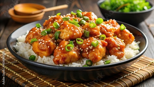 Savory orange chicken dish topped with crunchy green onions and sesame seeds atop a bed of steaming hot rice