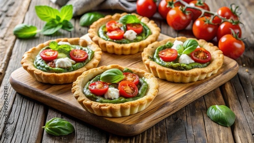 Savory pesto, tomato and feta tarts on a rustic wooden board , appetizer, tart, Mediterranean, snack, savory, homemade