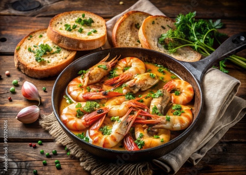 Savory prawns sizzling in a skillet, smothered in a rich garlic butter sauce, garnished with fresh parsley and served with crusty bread on a rustic table.