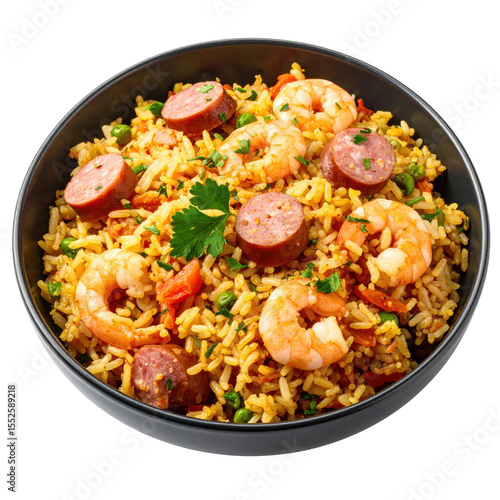 Savory shrimp and sausage rice dish in a bowl. cut out. transparent background