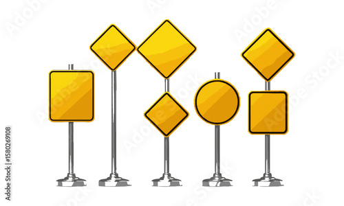 Scalable vector illustration featuring a series of empty yellow traffic road signs in various shapes, a realistic yellow road sign set, easily editable and scalable.