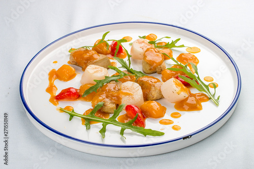 Scallop with strawberries and arugula. On white background