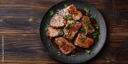 Scaloppine al Marsala veal scaloppine in Marsala wine sauce, plated on a sleek stone plate, dark wooden surface, top view, text space included.
