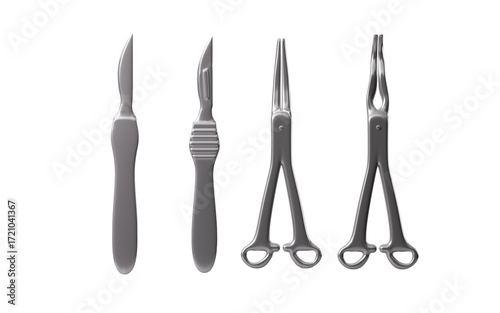 Scalpel, hemostatic forceps and so on surgical tools, 3d rendering.