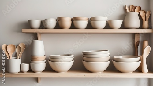 Scandinavian Kitchen Shelf with Ceramic Bowls and Wooden Utensils in Soft Beige Tones Under Natural Light