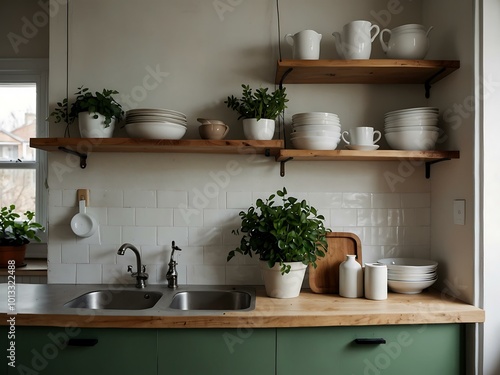 Scandinavian kitchen with wooden shelves, white ceramics, and green plants in natural light.