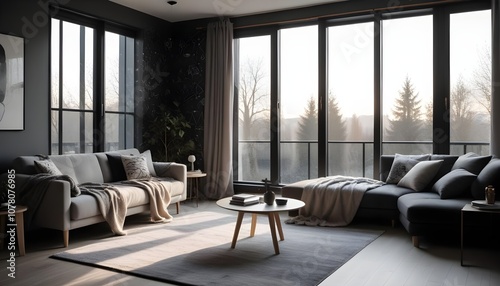 Scandinavian living room interior design zoom background,Doodle patterned wallpaper graphics
