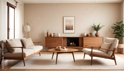 Scandinavian, mid-century style home interior design characterizes the modern living room, adding a touch of timeless elegance and sophistication